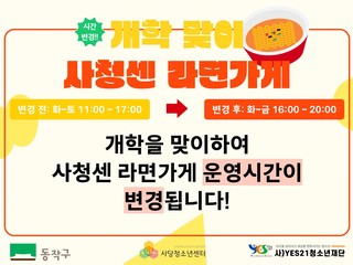 안녕하세요. 사당청소년센터입니다. 😊3월, 개학을 맞이하여 오늘 3/3(화)부터 기존 운영시간으로 운영합니다.(변경 전) 화~토, 11:00~17:00 → (변경 후) ...
