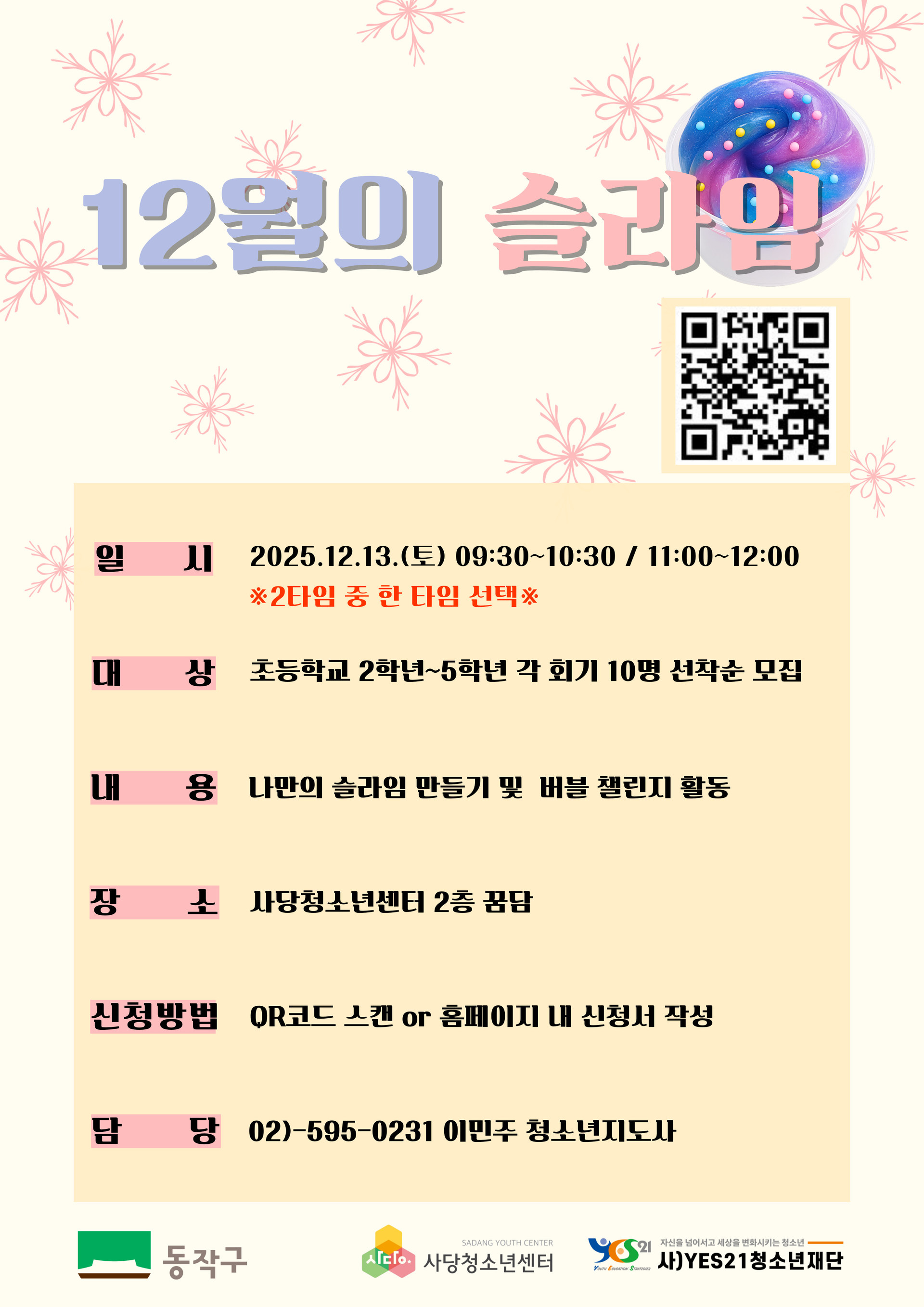 제공하신 정보는 사당청소년문화의집에서 운영하는 프로그램 사업 일정 안내 및 증빙서류 발급을 위해 사용됩니다.