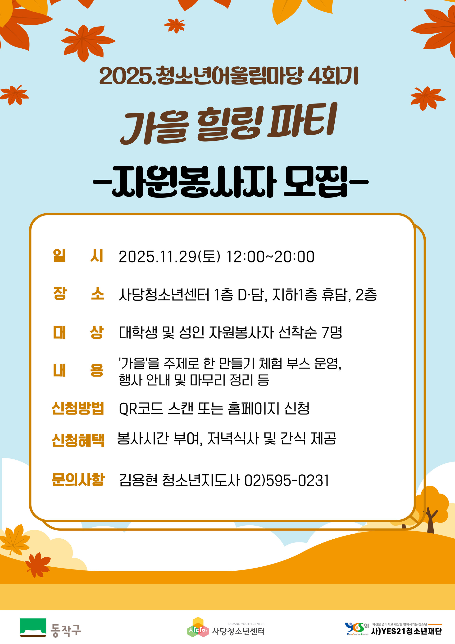 제공하신 정보는 사당청소년문화의집에서 운영하는 프로그램 사업 일정 안내 및 증빙서류 발급을 위해 사용됩니다.